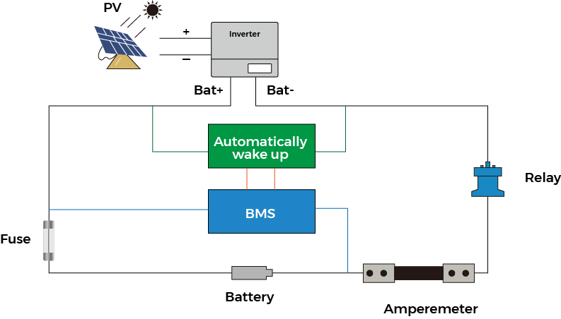 With our products, the customer only needs to check the inverter battery automatic start option. When the photovoltaic or grid starts the inverter again, the BAT port of the inverter will output a voltage of about 48V in a short time, and this voltage will act as the start of the BMS.